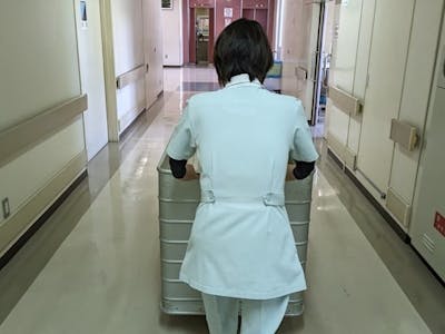 この仕事は、病院で使うリネン(布団とか枕カバー)を運んだり、片付けたりするお仕事やで。