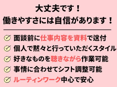 「職場の人間関係が不安…」「他人とのコミュニケーションが苦手…」そんな方にもピッタリのお仕事です。当社の作業は基本的に個人で黙々と行っていただくスタイルなので、ストレスなく作業に集中できます。
