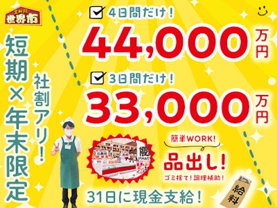 ≪年末限定!3日or4日の短期!≫日給11000円☆12/31に全額現金払い☆スーパーの裏方STAFF☆レジなし☆未経験OK!主婦・学生・フリーター皆さん大歓迎