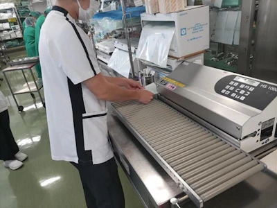 洗浄後は器材の点検を行い、セット組や包装紙等に一つずつ器材を入れて包装して専用の装置で滅菌を行います。